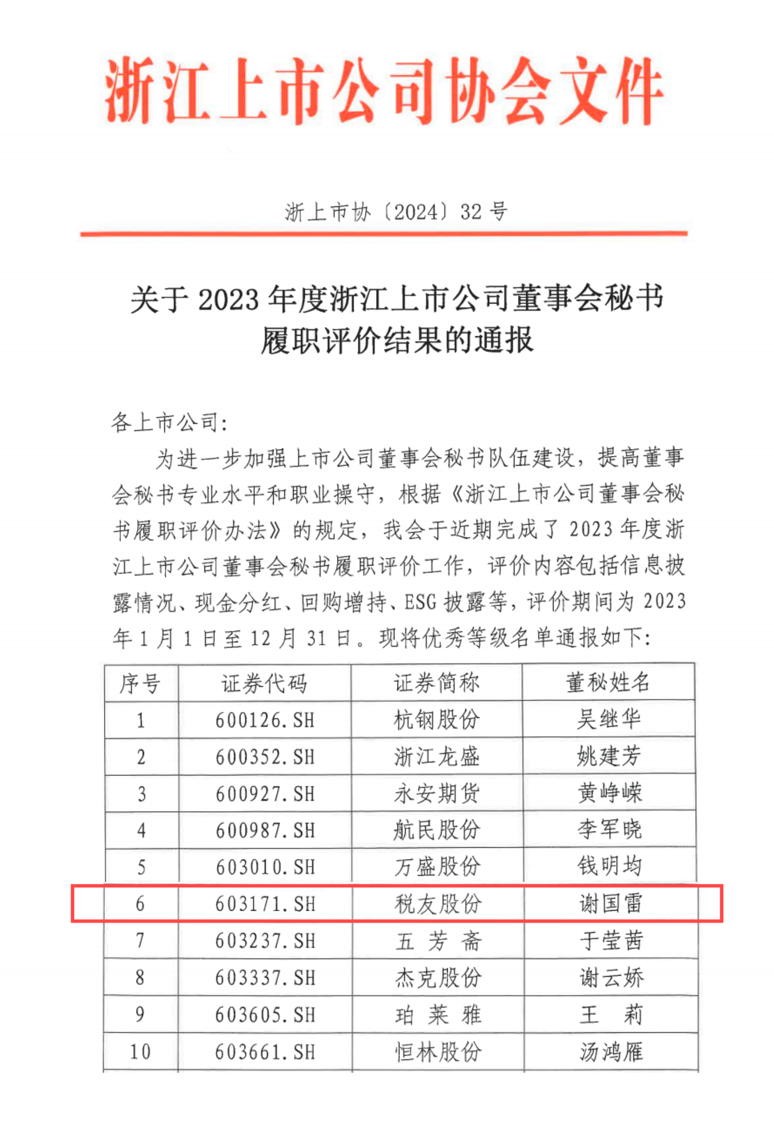 12月20日,浙江上市公司協(xié)會(huì)發(fā)布“2023年度浙江上市公司董事會(huì)秘書履職評價(jià)”結(jié)果。30家浙江上市公司董秘榮獲優(yōu)秀等級履職評價(jià),其中,稅友股份董事會(huì)秘書謝國雷先生獲此殊榮,體現(xiàn)了資本市場對公司制度建設(shè)、信息披露、內(nèi)部控制、投關(guān)管理和ESG管理等各項(xiàng)工作成果的高度認(rèn)可。